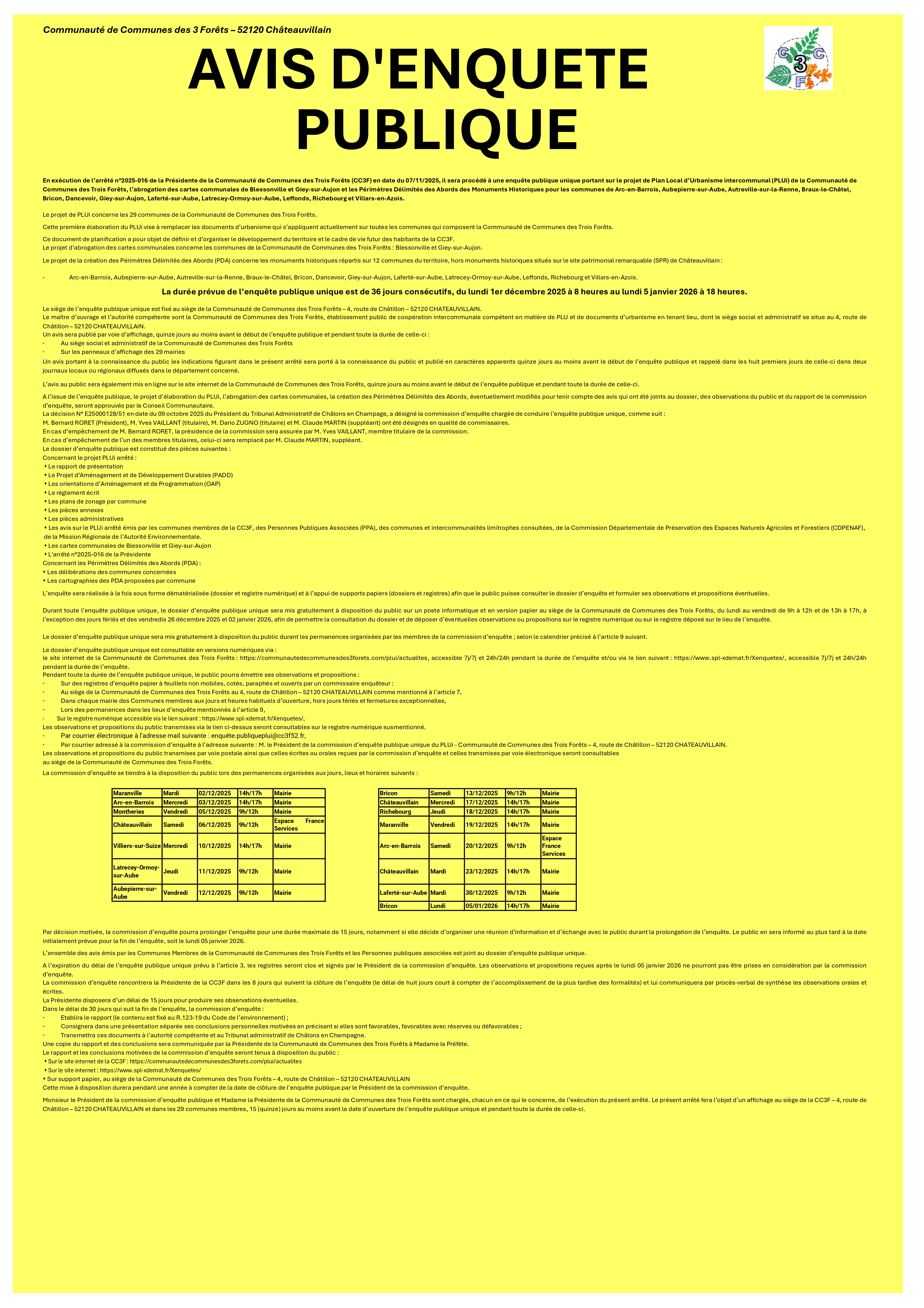 Arrêté de la Présidente de la CC3F n°2025-016 du 07/11/2025 et Avis d’enquête publique