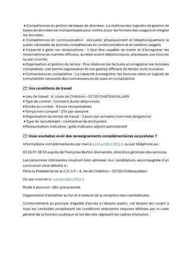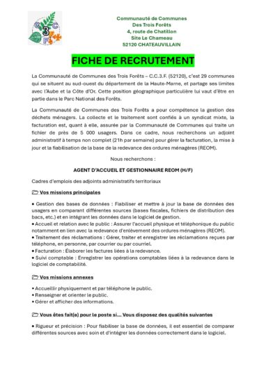 La CC3F recrute un agent administratif (H/F) pour un CDD de 6 mois renouvelable de 21 h/semaine.